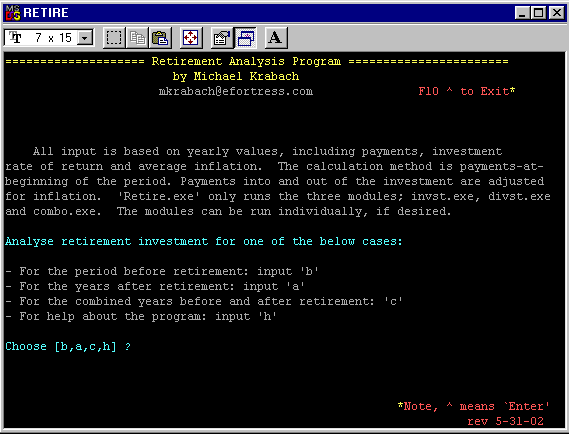 Download the zip file and unzip all files into a folder. Source code included. Scan it for viruses if you worry. Drag a shortcut of the 'retire.exe' to the Desktop. When run it will appear as a DOS window. Below is a sample of the starting screen in “retire.exe”. Click on any of the cases or 'Choose' options in the sample screen to see the corresponding sample screens.